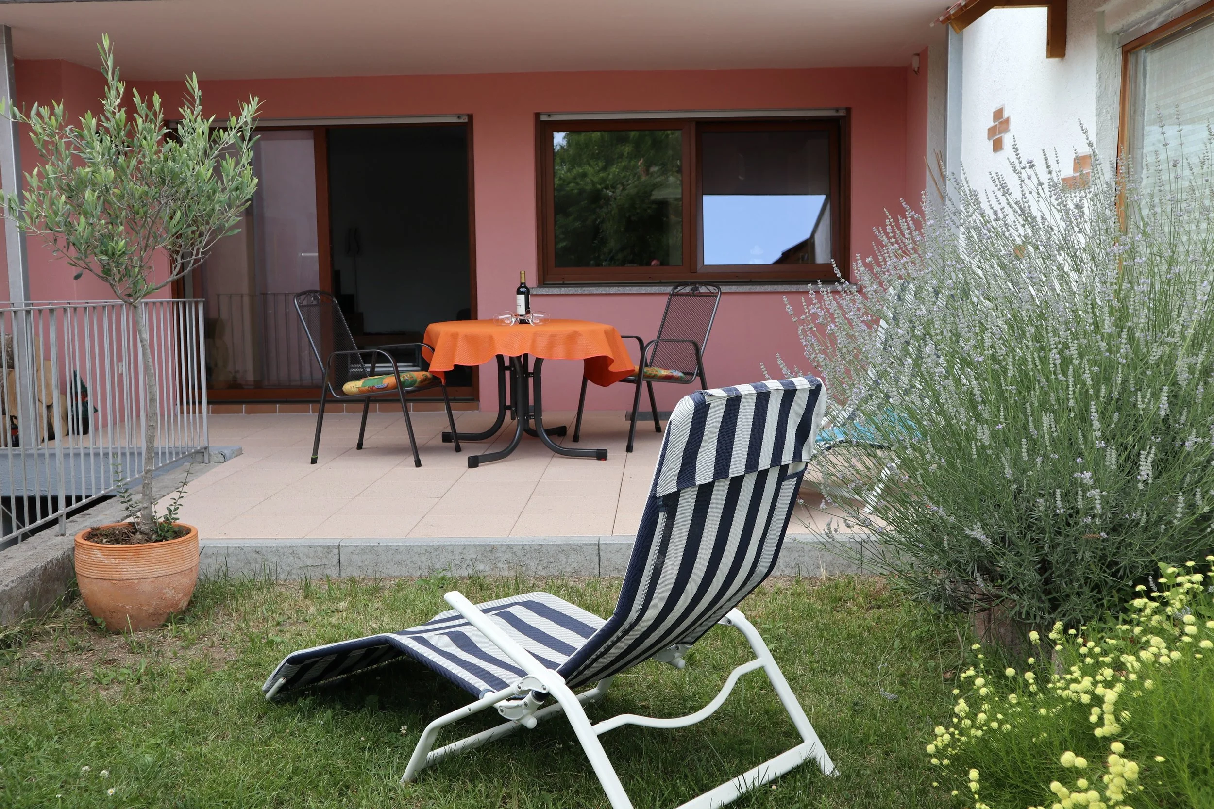 Eine Terrasse mit 18qm mit Tisch, Stühlen und Liegen laden Sie herzlich ein
